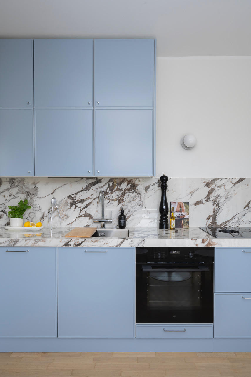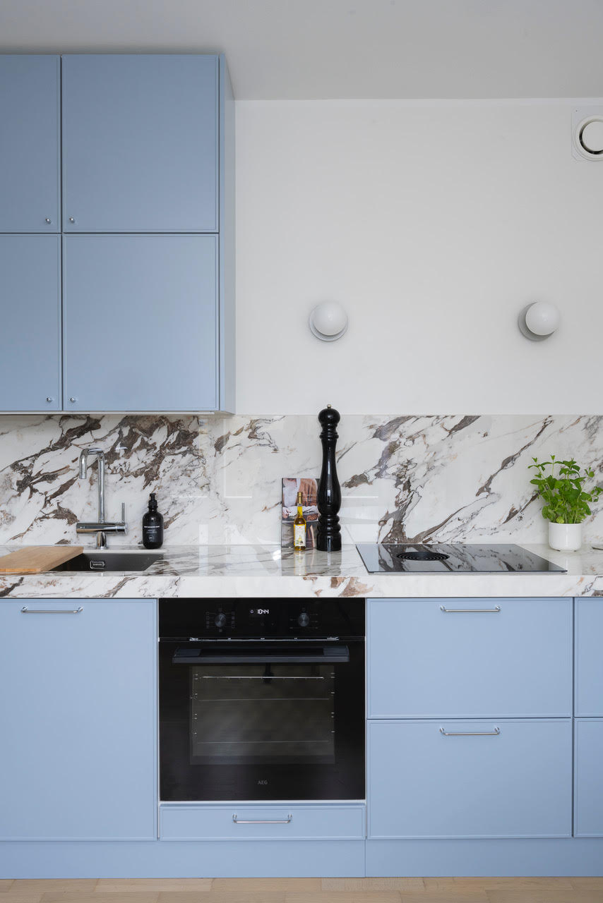 Kaapistojen vaaleansininen sävy on raikas ja rauhoittava, ja se tuo keittiöön persoonallisuutta ilman, että tila tuntuu raskaalta. Kaapistojen mattapintaiset ovet kapeilla kehyksillä tuovat mielenkiintoa kokonaisuuteen. Työtaso ja välitila ovat näyttävää kertaamista kiveä. Tason paksuus on 6cm. Paksu taso on kaunis yksityiskohta kokonaisuudessa ja luo upeaa kontrastia rauhallisten kaapistojen kanssa.