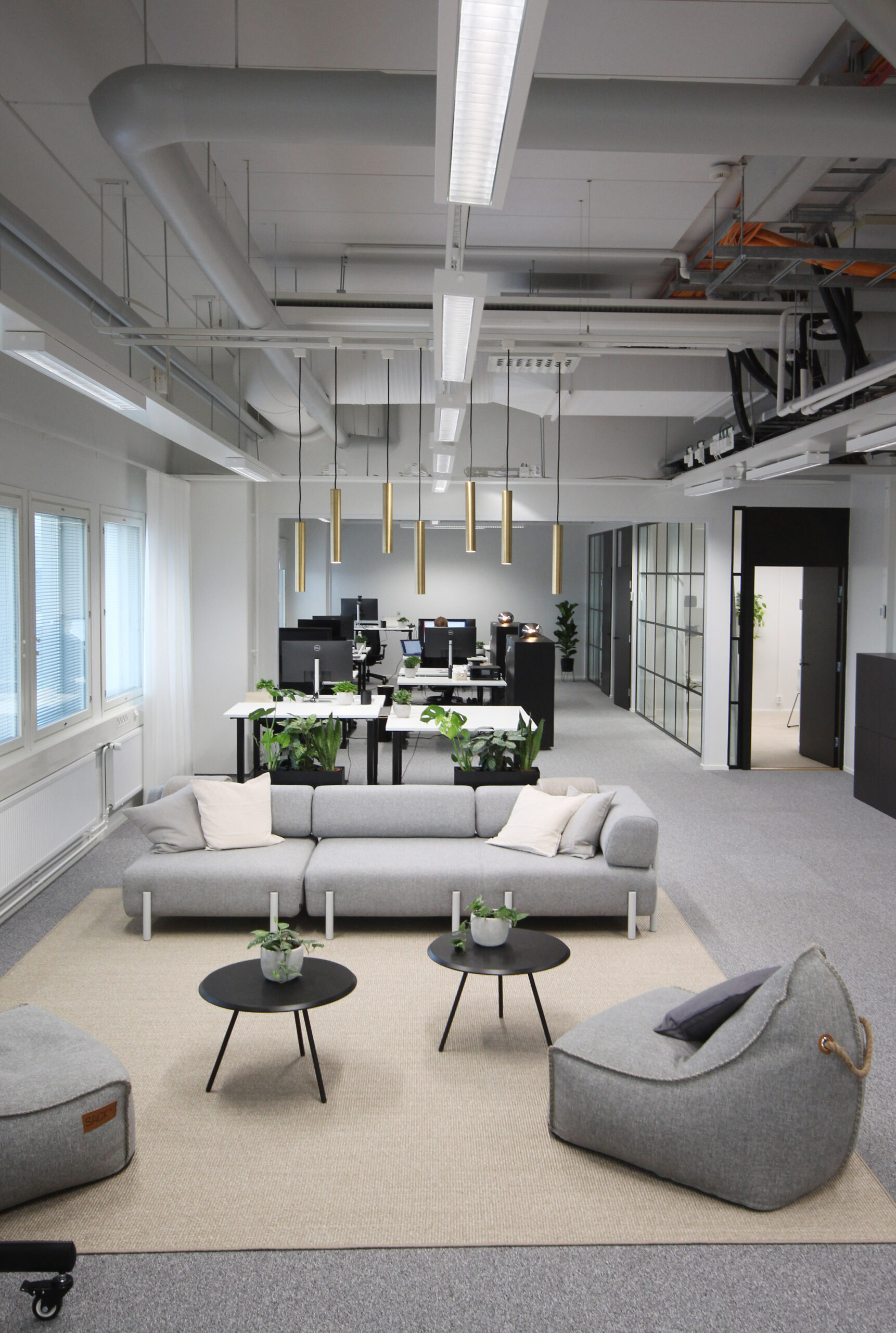 Oleskelutilan rentoa tunnelmaa yhdistettynä avotilan työpisteisiin. Toimitilaan tehtiin rakenteellisia muutoksia mm. neuvottelutilan seinien suhteen. Neuvottelutilan lasiseinäksi valikoitui akustiikaltaan hyvä lasiseinä mustilla ruudukoilla. Oulun toimiston sisustussuunnittelu seuraa yrityksen Helsingin toimipisteessä luotua linjaa.