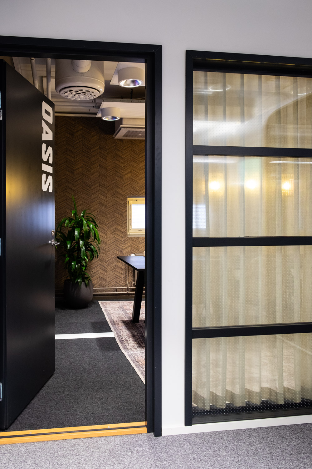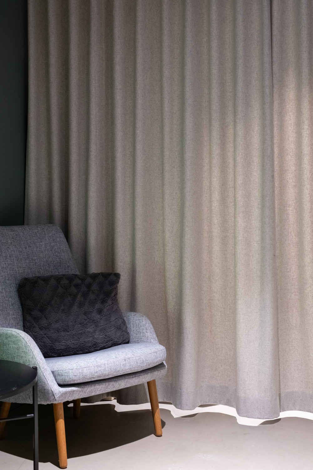 Isompi, osuvasti Oasikseksi nimetty neuvottelutila sai suureen ikkunaansa läpikuultavat verhot, joiden maanläheinen väri ja tekstuuri sovivat hienosti tilan rauhalliseen sisustukseen. Valo pääsee verhojen läpi tilaan, joten se ei missään kohtaa tunnu pimeältä.