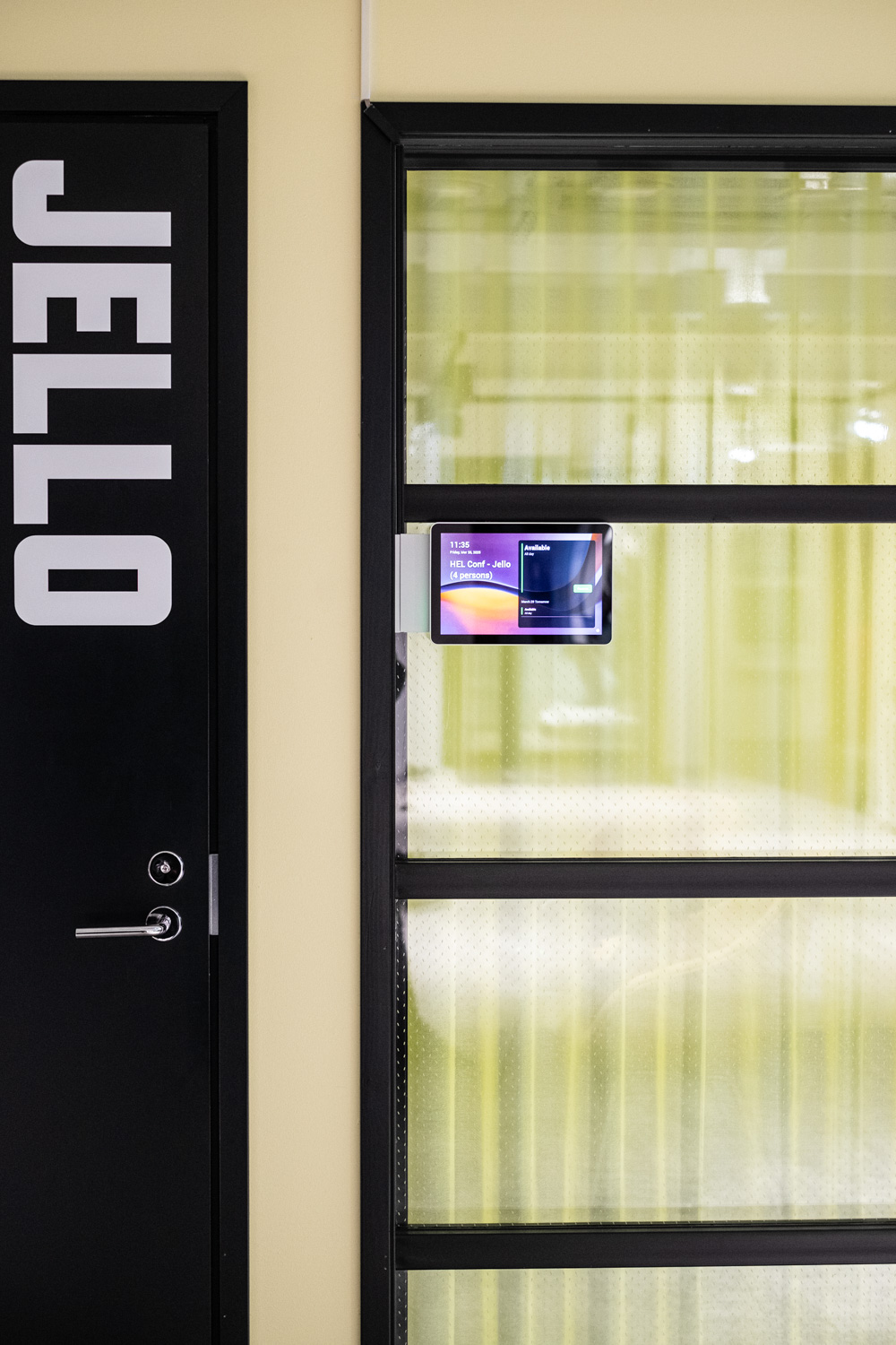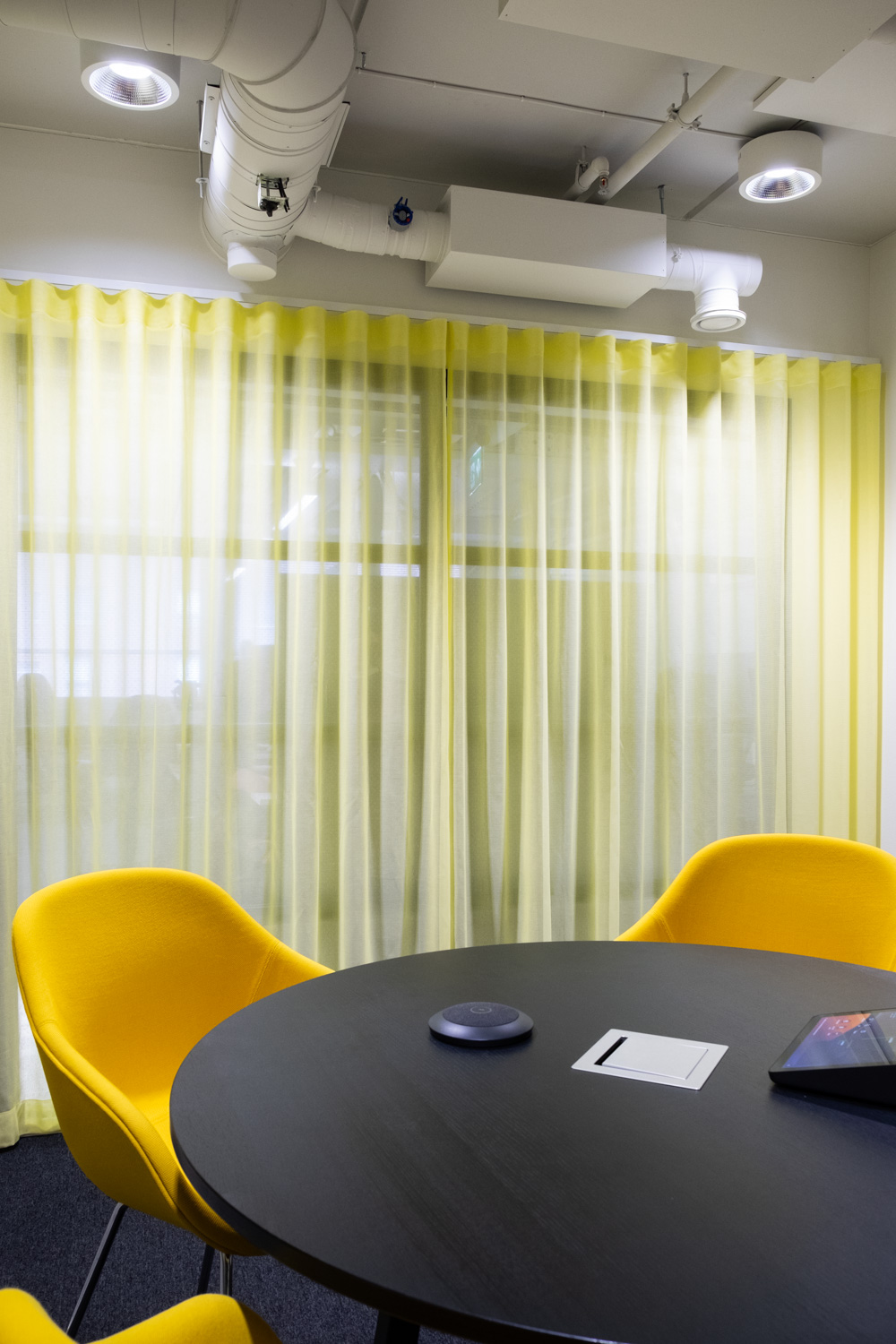 Jello-neuvottelutilan keltaiset verhot tilan sisäpuolelta.