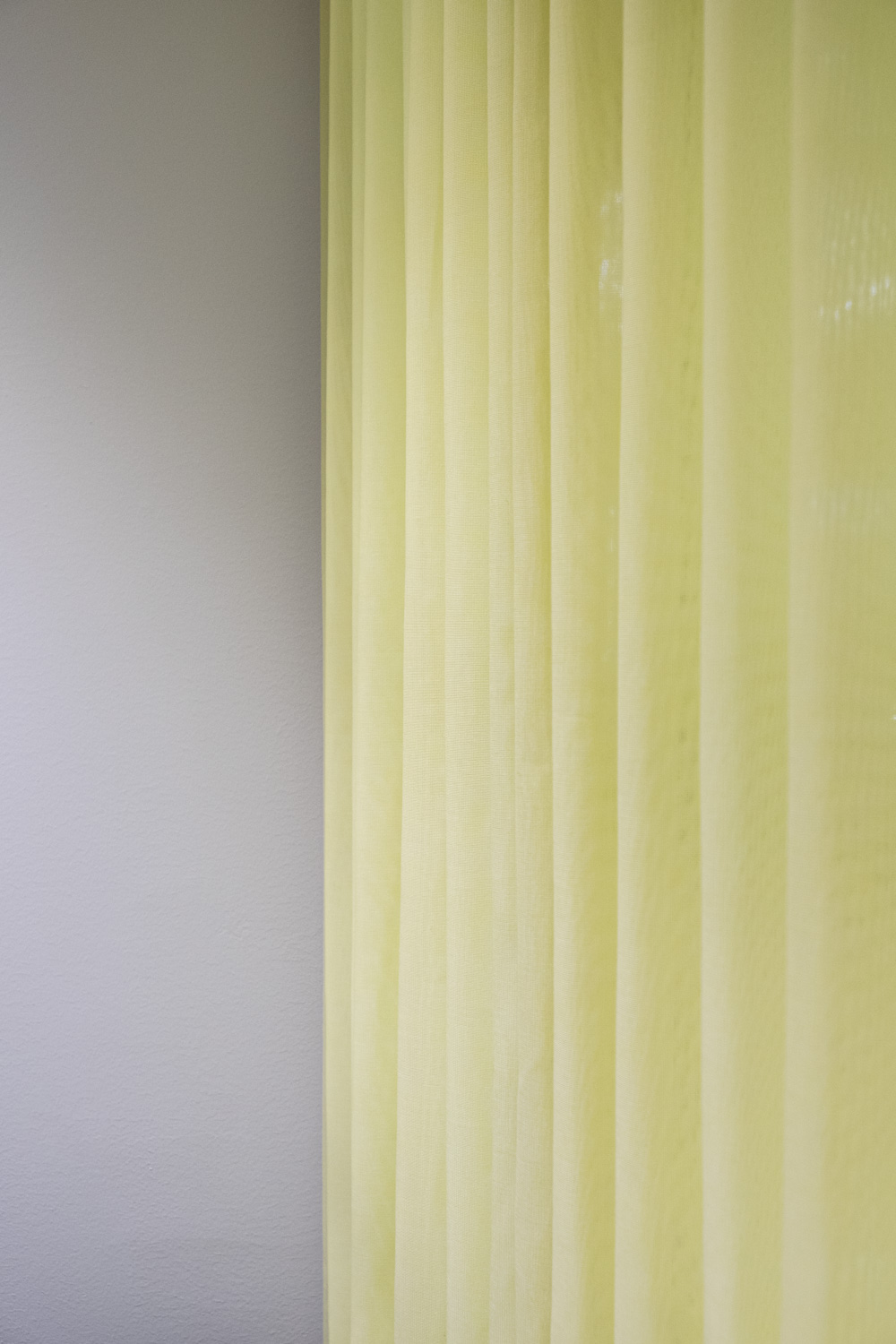 Jello-huoneeseen valittiin kirkkaankeltaiset, läpikuultavat verhot, jotka tuovat tilaan leikkisää tunnelmaa ja päästävät samalla huoneeseen valoa lävitseen. Verhot näyttävät kuvissa hempeämmiltä kuin livenä ovatkaan. Pirteä sitruuna on paikan päällä hyvinkin ilahduttava värivalinta.