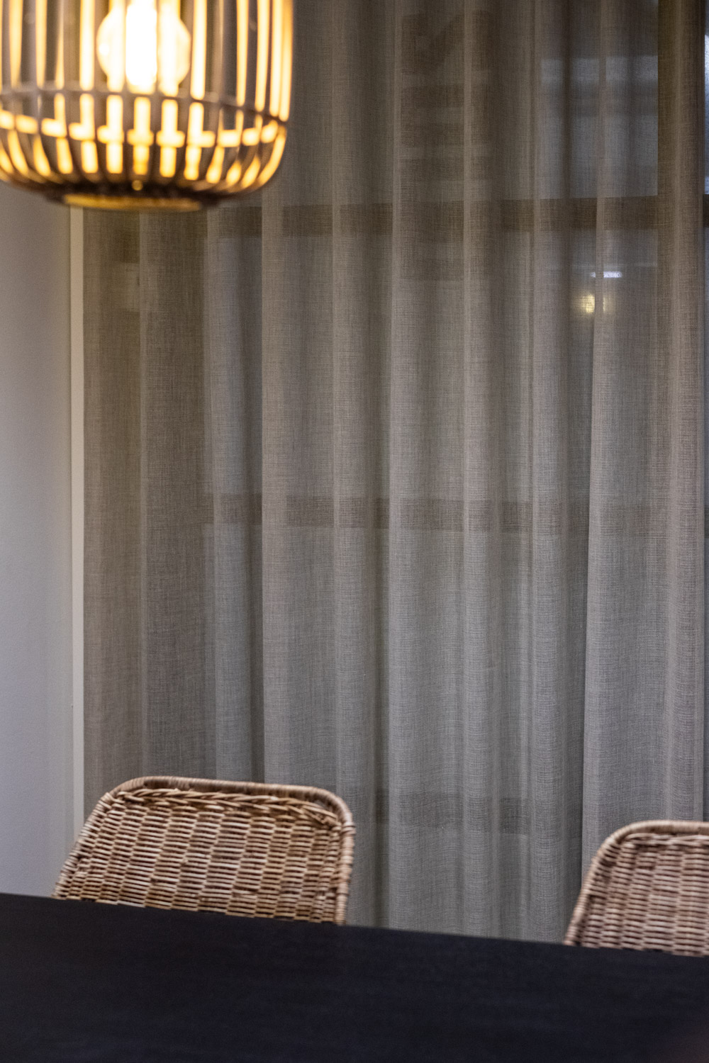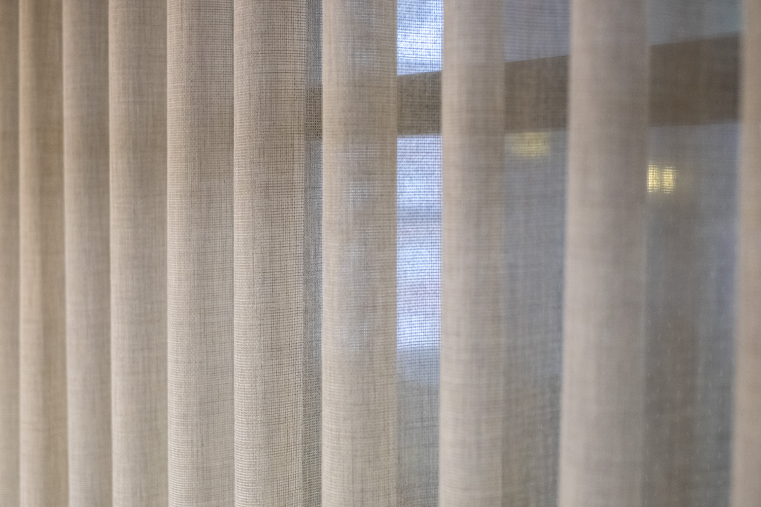Neuvottelutilan läpikuultavat verhot tuovat tilaan rauhallista tunnelmaa.