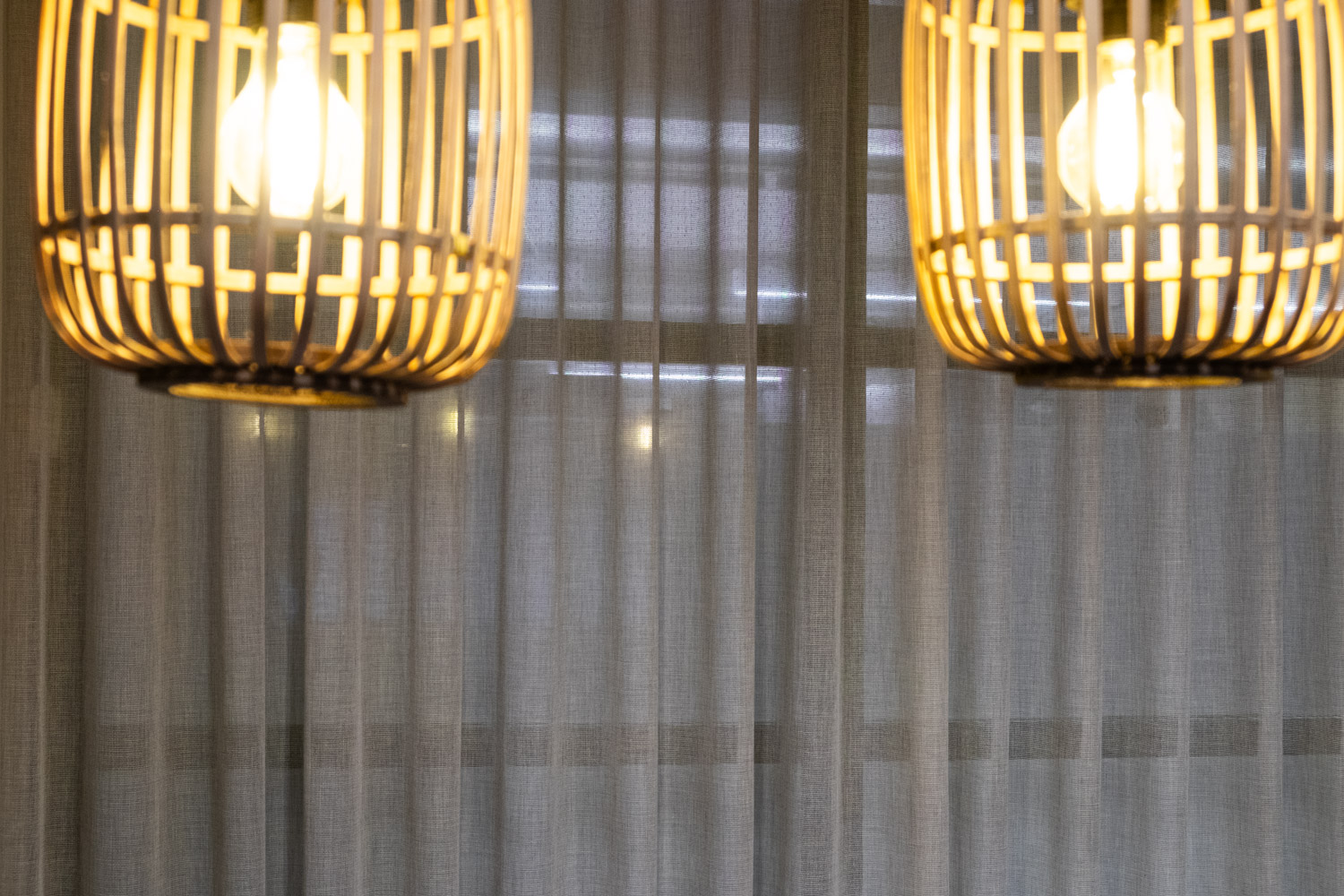 Jello-neuvottelutilan keltaiset verhot lähikuvassa.