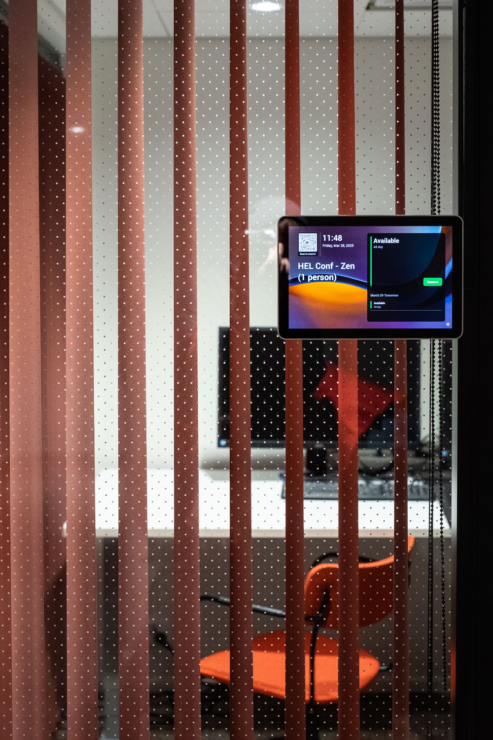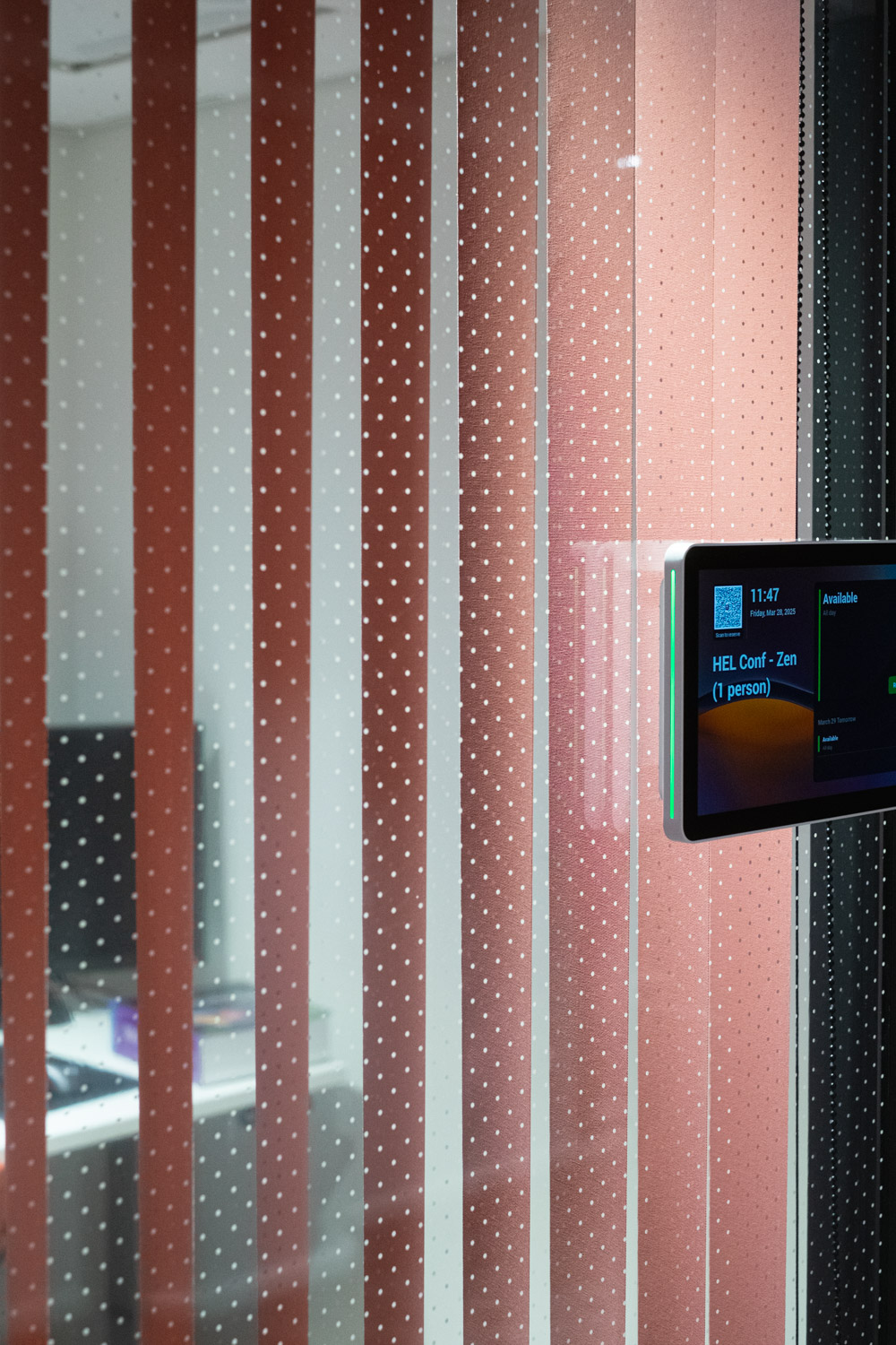 Zen on pienempi tila, jossa työntekijä saa työskennellä omassa rauhassaan. Punaiset lamelliverhot yhdistyvät pilkulliseen lasiin ja mustiin metallikehyksiin. Lamelliverhoilla tilan saa hetkessä suljettua ulkomaailmalta, kun tarvitaan työrauhaa.