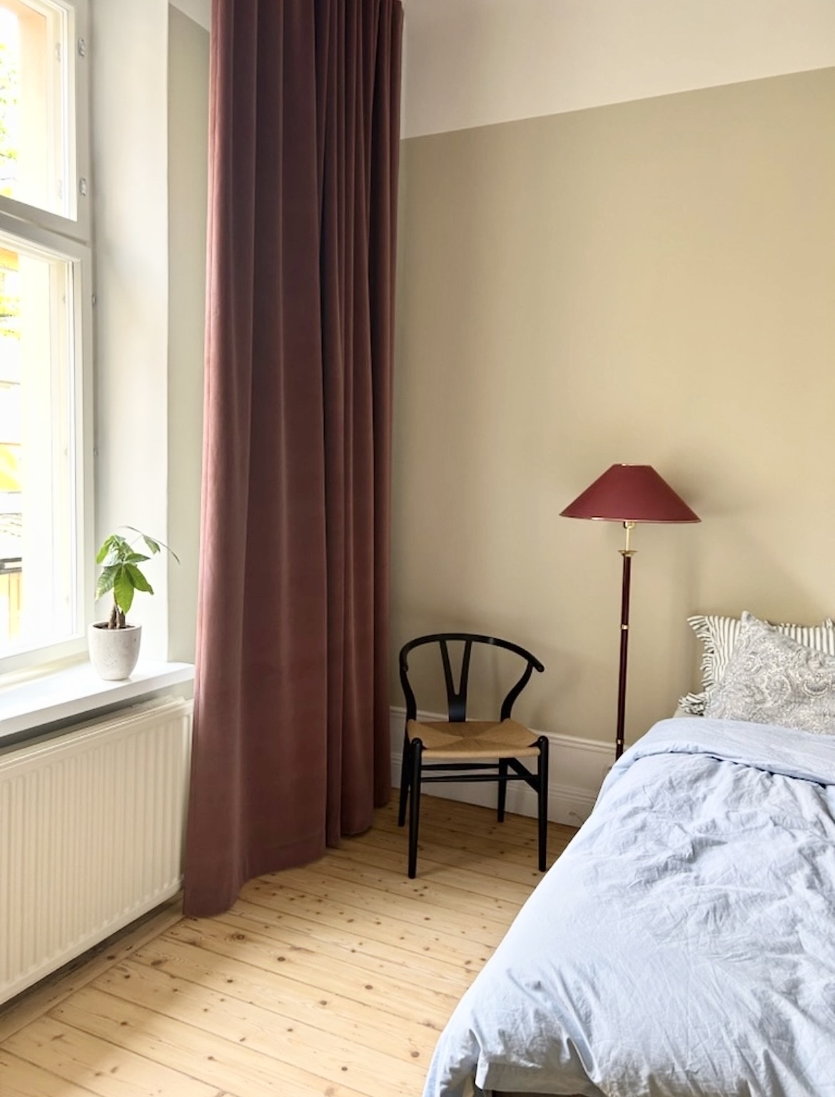 Vanhoissa asunnoissa on usein näyttäviä muotoja ja kurveja. Tässäkään kohteessa olohuone ei ollut ongelmaton ja asentajalta vaadittiin raudanlujaa ammattitaitoa, jotta elegantin olohuoneen verhokiskot saattiin kaartumaan ikkunalinjan mukaan. Makuuhuoneeseen valikoitu pimentävä satiiniverho kauniin marjapuuron sävyisenä.