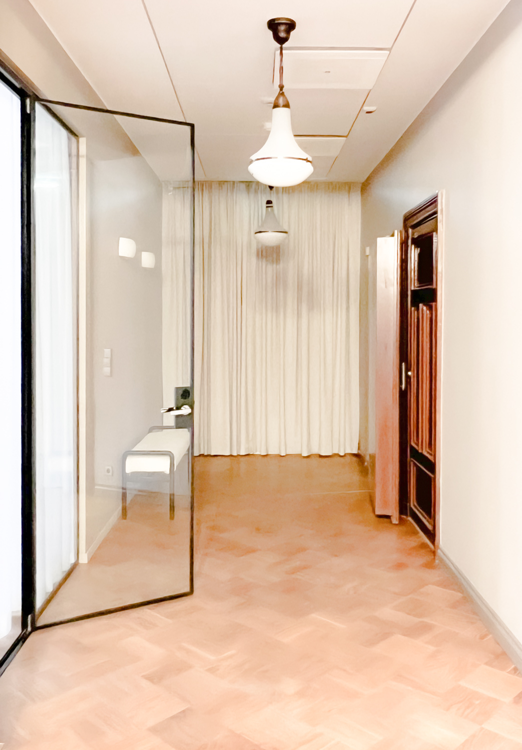Klinikan eri tiloihin tehtiin yhteneväinen verhosuunnitelma, joka imartelee tilan upeaa arkkitehtuuria. Valtavat ikkunat ja kasettikatto suorastaan vaativat pitkiä, hempeämmänvärisiä verhoja täydentämään luomaansa tunnelmaa. Samaa linjaa jatkettiin hoitohuoneissa ja aulatiloissakin. Hoidimme myös hoitohuoneen penkinpäällisen ajan tasalle.
